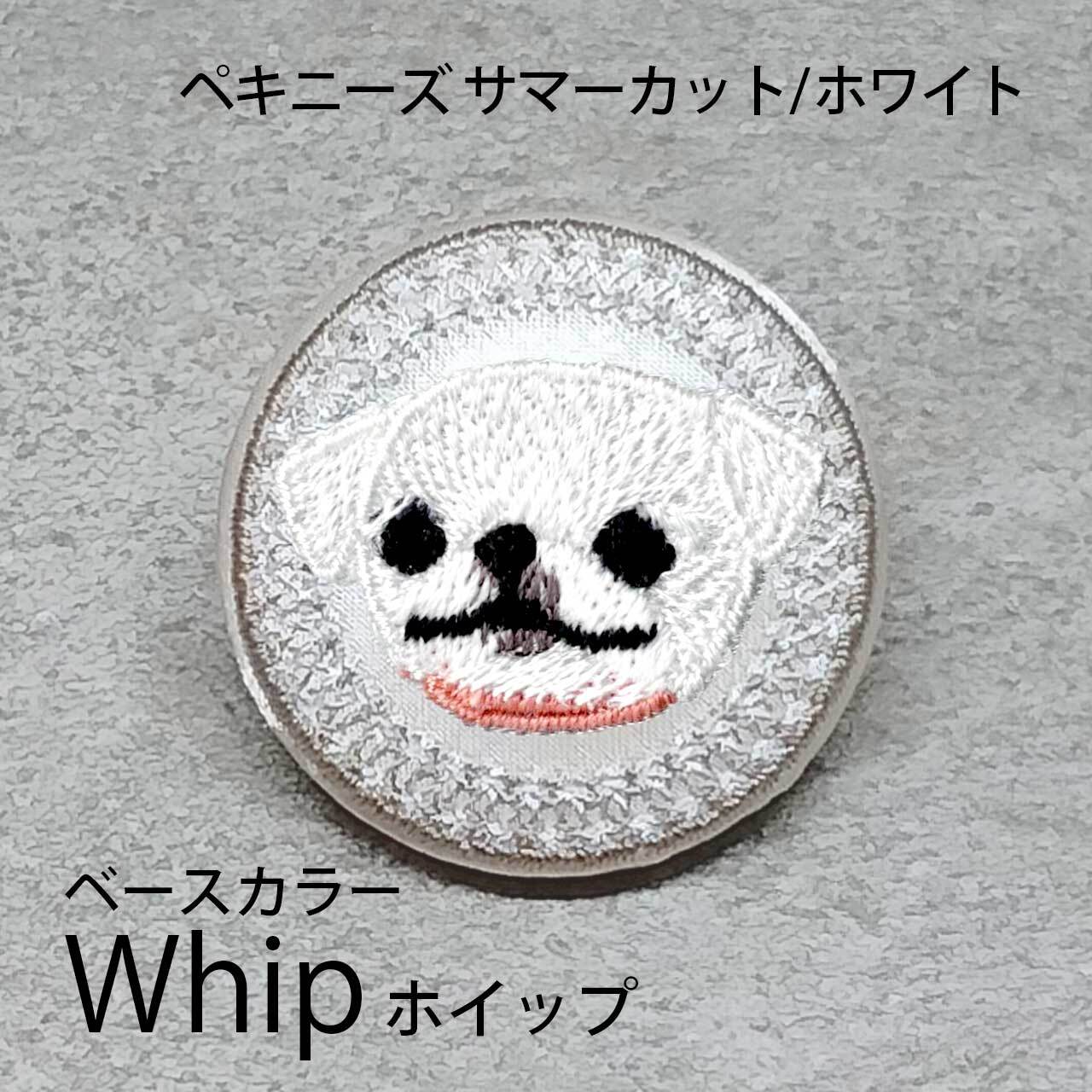 サテン生地にホワイトのペキニーズ サマーカットを刺繍したアイテム。