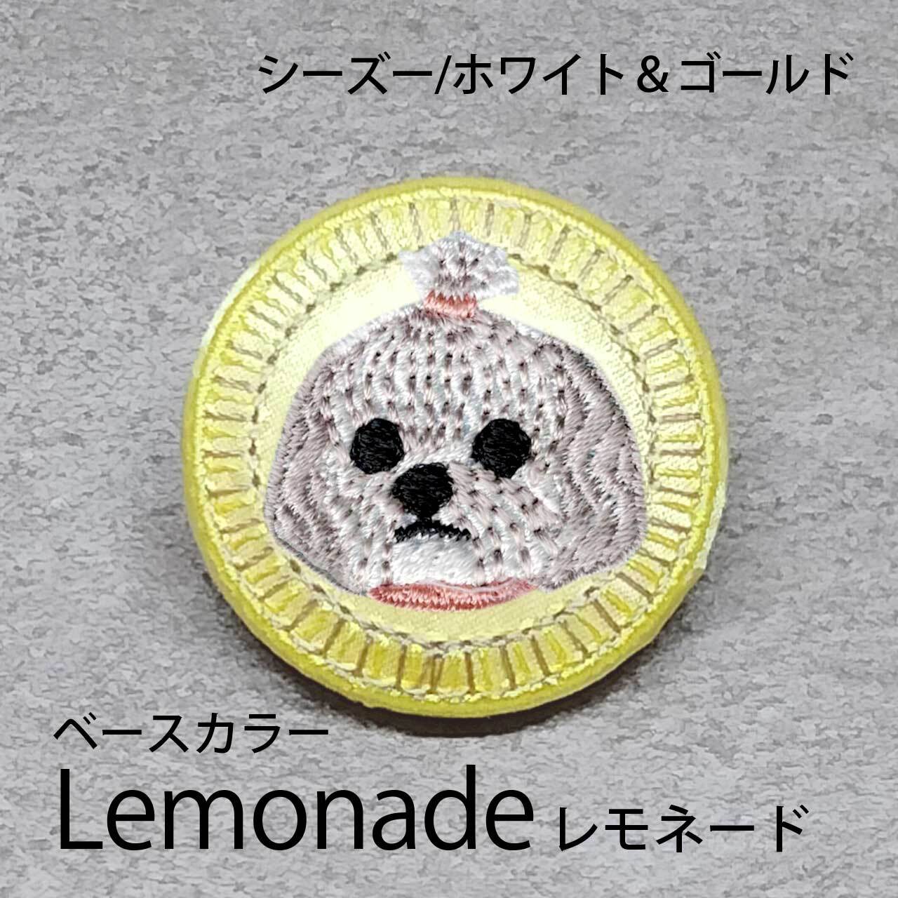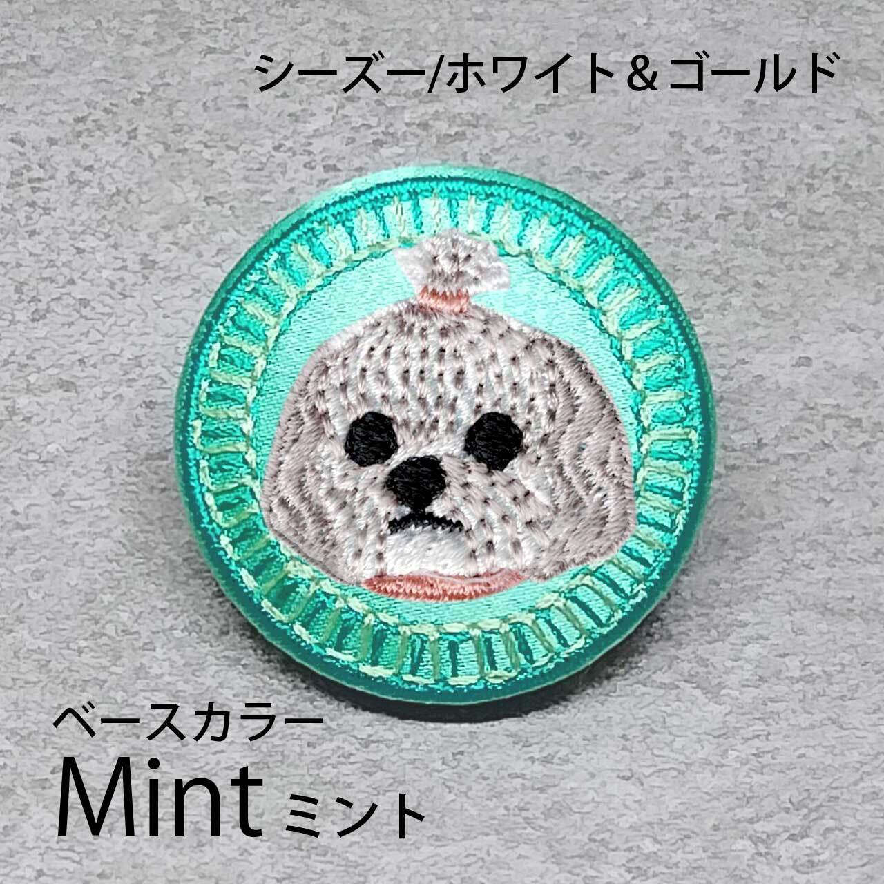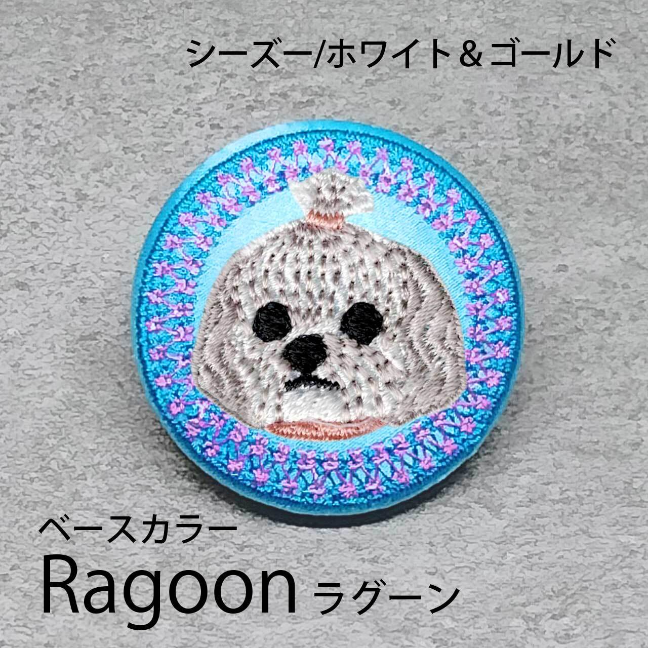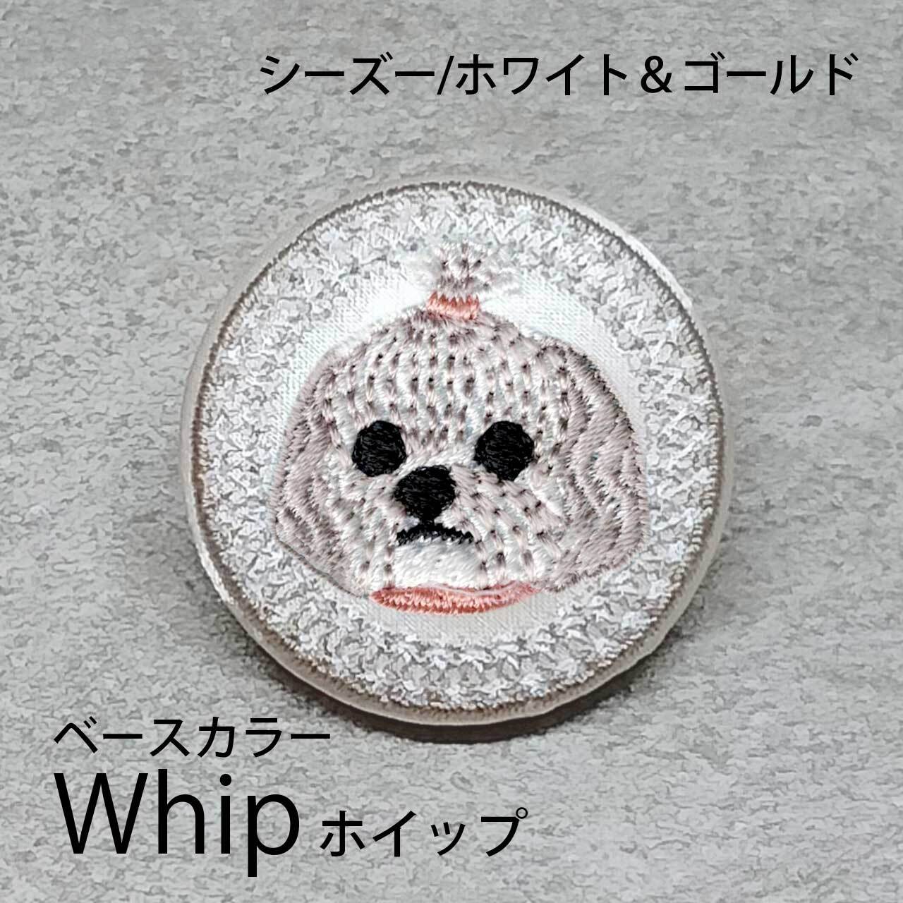 サテン生地にホワイト&ゴールドのシーズーを刺繍したアイテム。