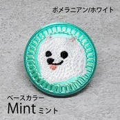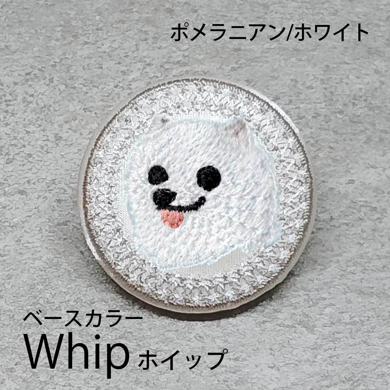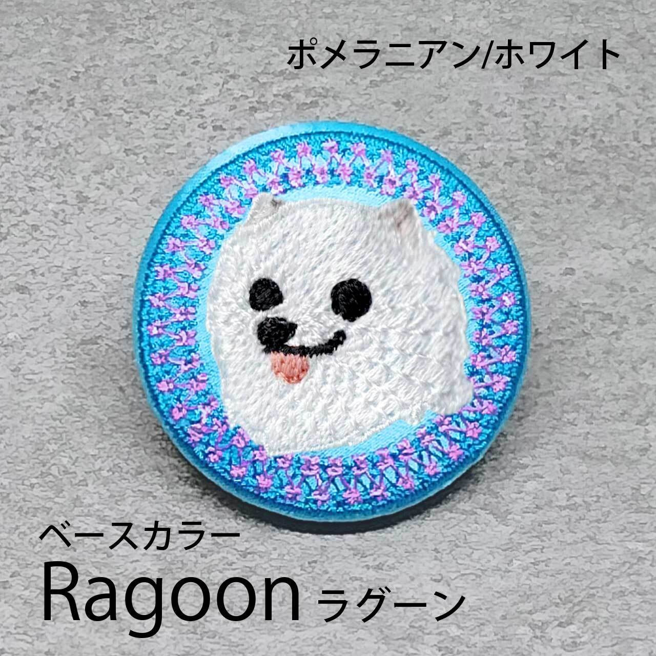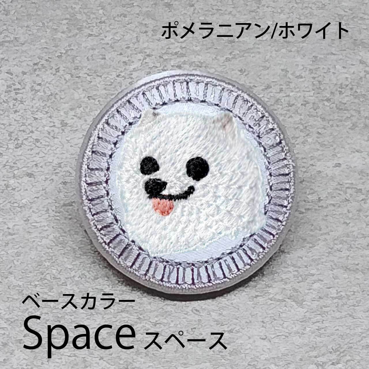 サテン生地にホワイトのポメラニアンを刺繍したアイテム。
