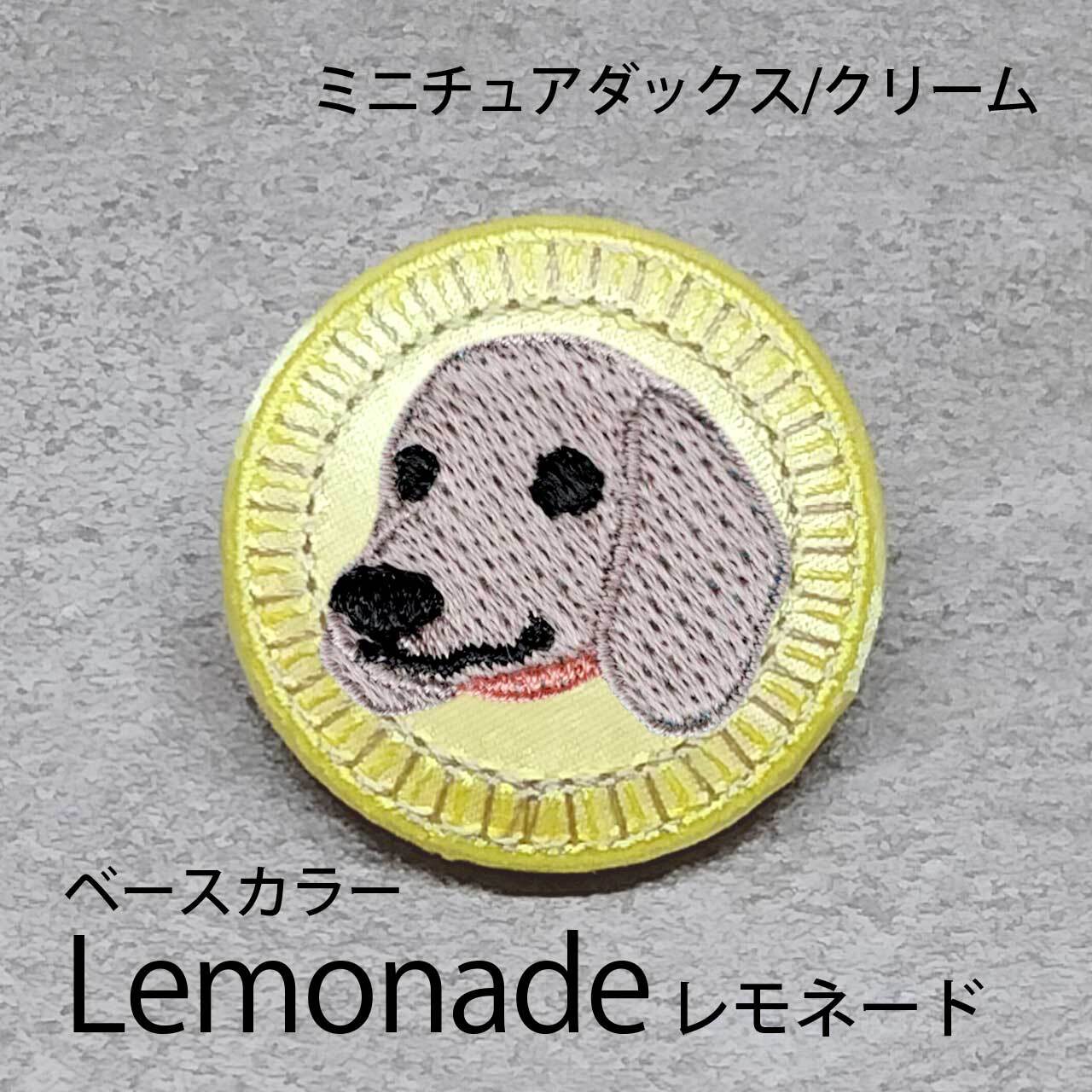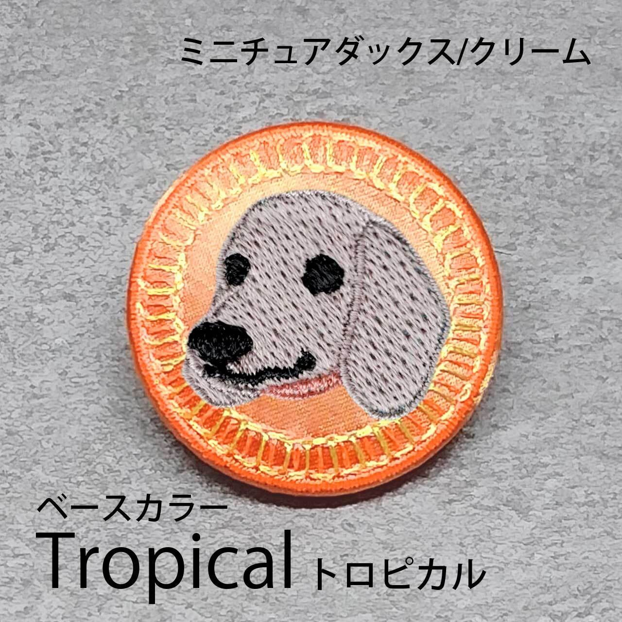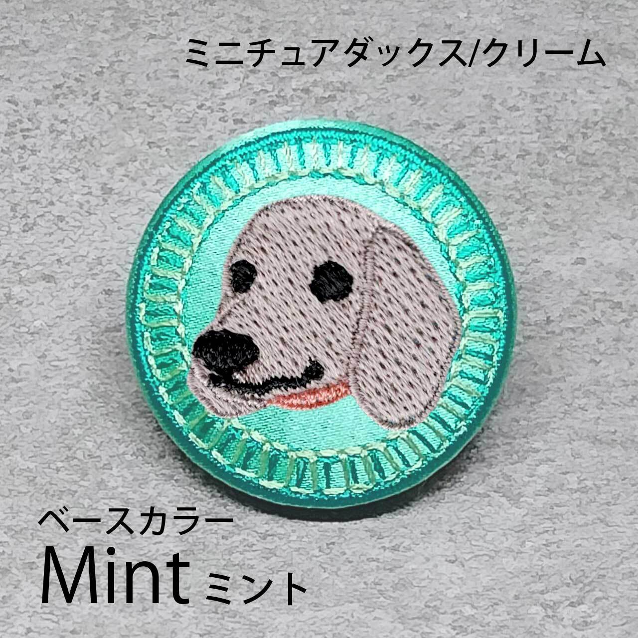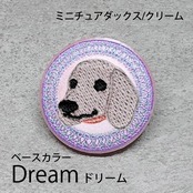 サテン生地にクリームのミニチュアダックス(スムース)を刺繍したアイテム。