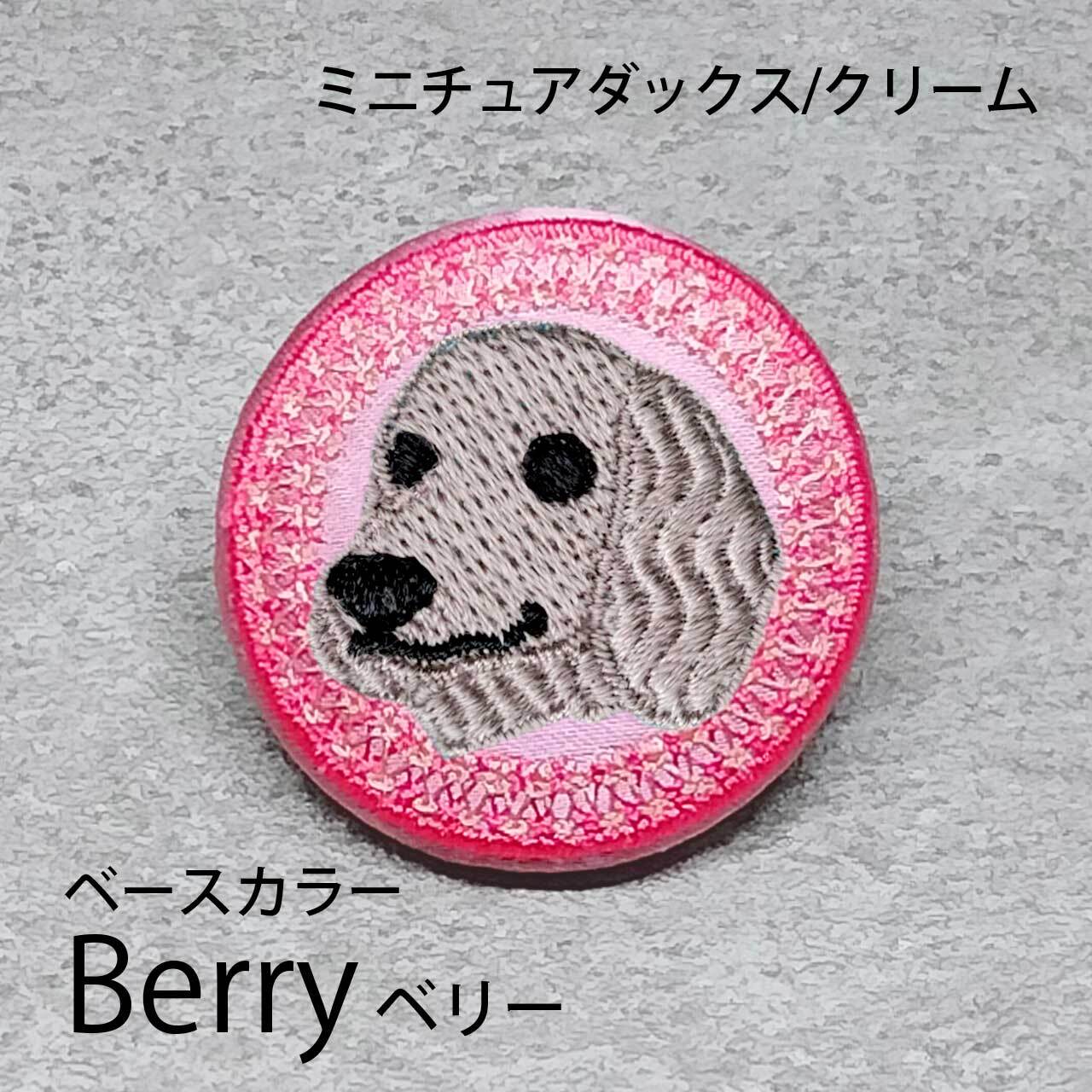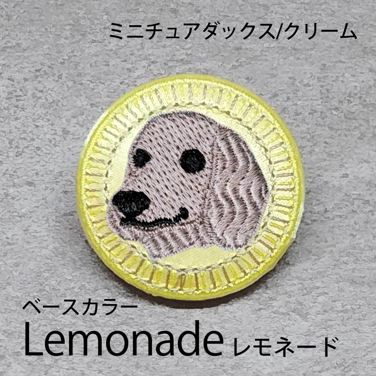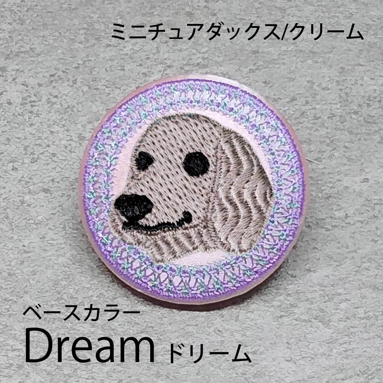 サテン生地にクリームのミニチュアダックス(ロング)を刺繍したアイテム。