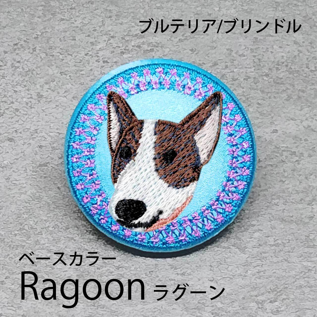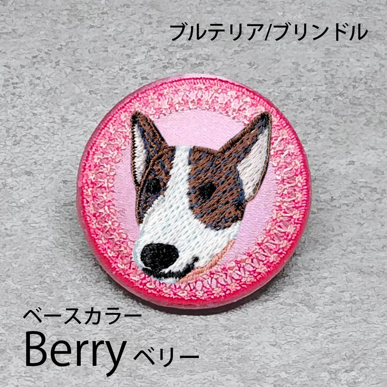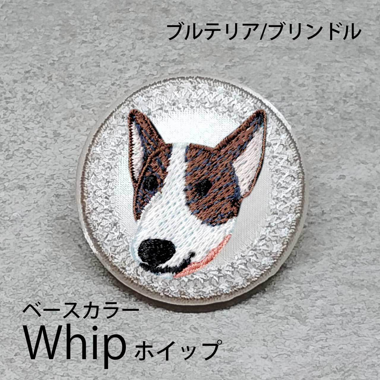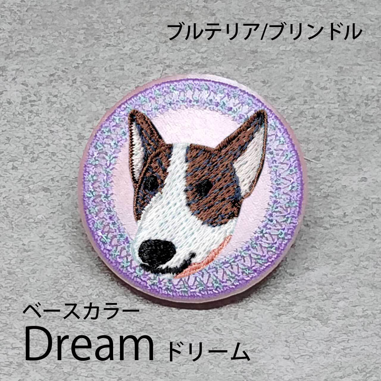 サテン生地にブリンドルのブルテリアを刺繍したアイテム。