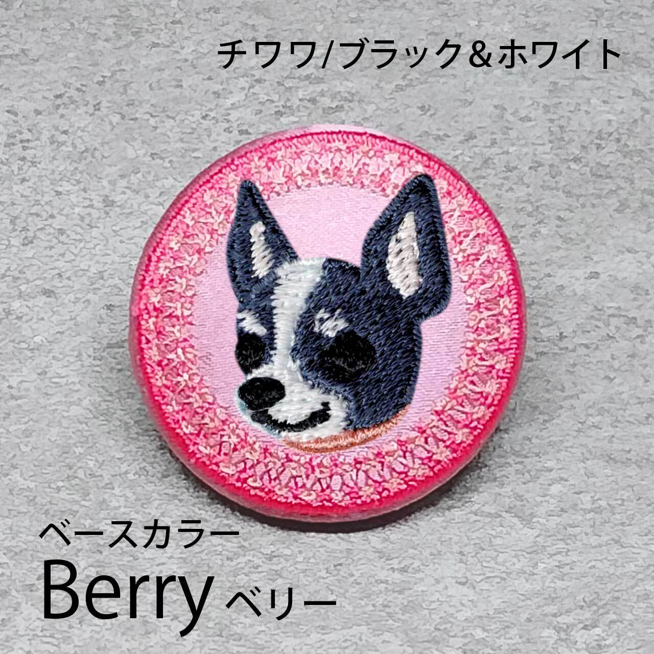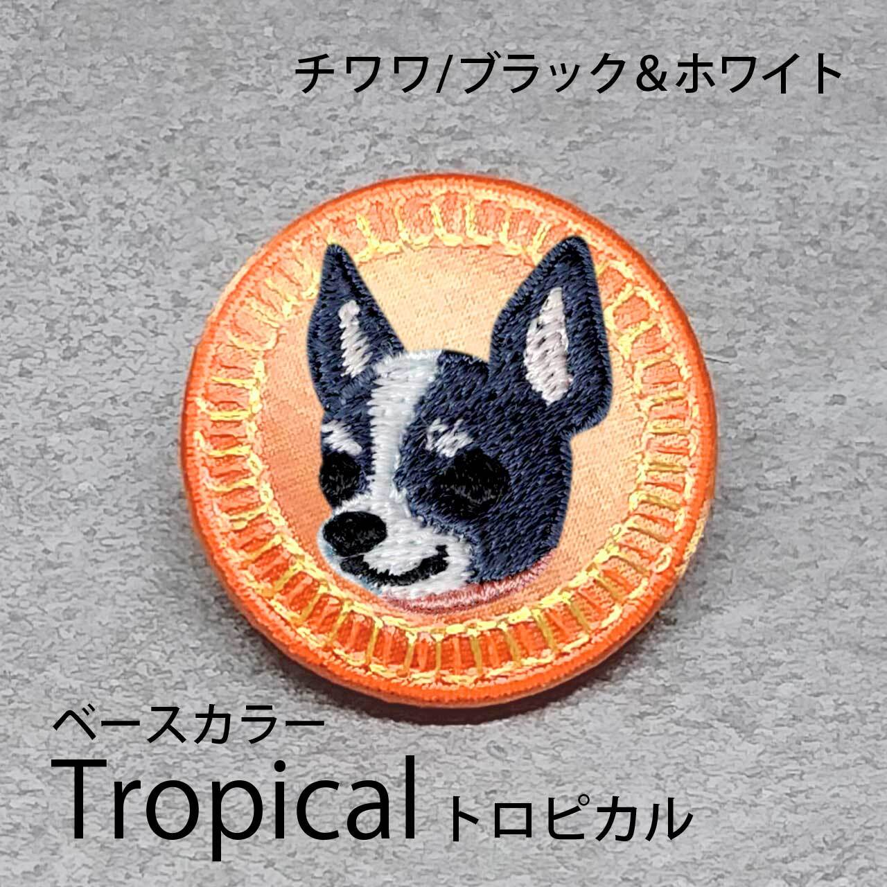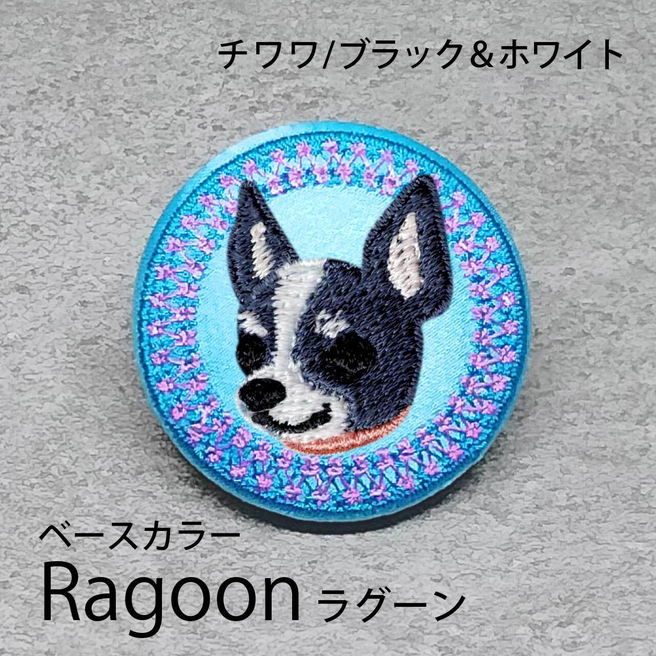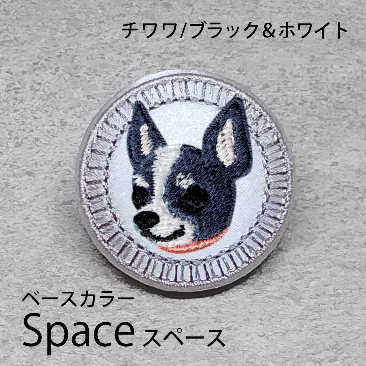 サテン生地にブラック&ホワイトのチワワ(スムース)を刺繍したアイテム。