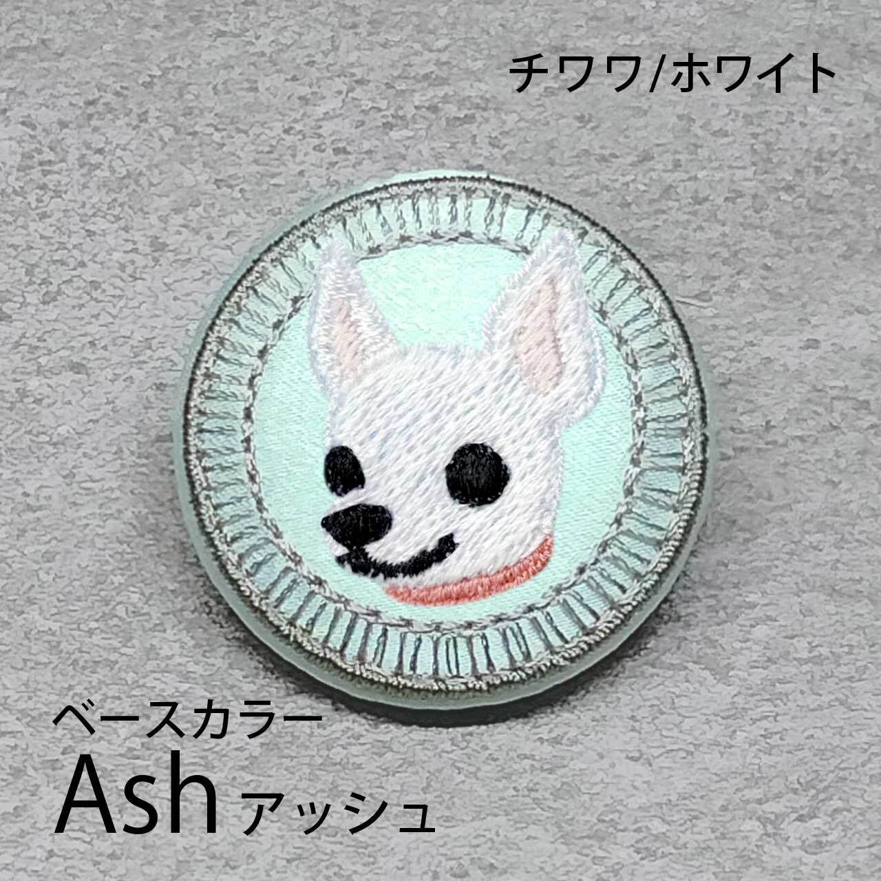 サテン生地にホワイトのチワワ(スムース)を刺繍したアイテム。