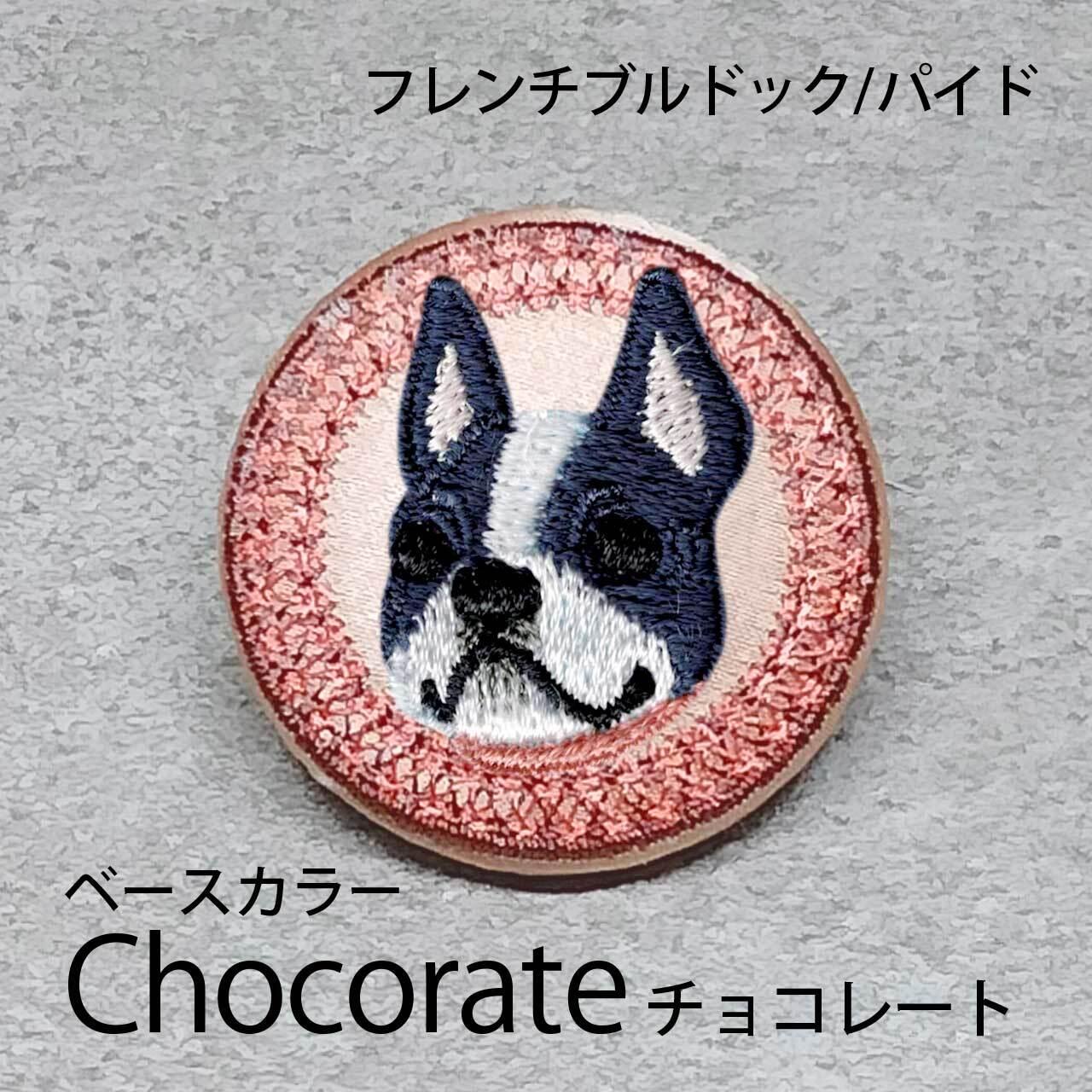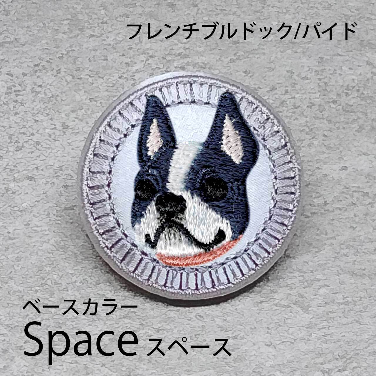 サテン生地にパイドのフレンチブルドックを刺繍したアイテム。